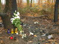 A hétvégi baleset nyomai még ma, hétfőn is jól láthatóak. Elégett alkatrészek, rongydarabok vannak mindenütt. Ugyanakkor vannak, akik mécsesekkel, virágokkal emlékeztek a 28 éves fiatalemberre.