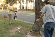"Hangtomográffal több mint 300 fát vizsgálnak át idén. Ez a műszer az érzékelők kopogtatása nyomán a fa belsejében méri a hang terjedési sebességét."