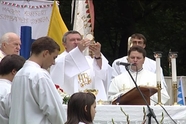 Veres András celebrálta az ünnepi szentmisét Szent István király szobránál, ahol a megyés püspök a hagyományok szerint megáldotta az új kenyeret, amit szétosztottak a szombathelyiek között.