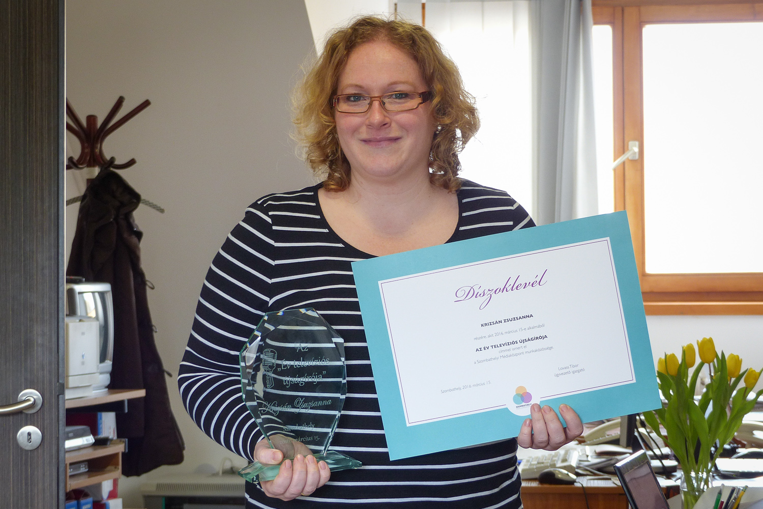A stúdióban Lovass Tibor ügyvezető igazgató beszélt a sajtó szerepéről a kollégáknak. Mint mondta, hosszú utat kell bejárnia egy újságírónak ebben a szakmában, miközben óriási a felelőssége. Tehetségre és tudásra egyaránt nagy szükség van ahhoz, hogy valaki jól bánjon a szavakkal, amelyek a közönség hangulatát is befolyásolni képesek. Az igazgató a szerkesztőség döntését tolmácsolva nyújtotta át az Év Televíziós Újságírója plakettet. Krizsán Zsuzsanna több mint tíz éve munkatársa az önkormányzati médiumnak. Először teletext-, majd webszerkesztői feladatokat látott el, később szerkesztő-riporterként és felelős szerkesztőként dolgozott, és dolgozik ma is. A díjat kimagasló szakmai munkájáért vehette át.