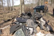 A Szombathelyi Erdészeti Zrt. munkatársa egy autóbontásból származó hulladékkupacot vizsgál az erdőben. Ülések, műszerfalak, benzintank és egy összetört szélvédő is van a hatalmas halomban. A szabályok szerint azé a szemét, akinek a területén van.
