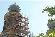 Szinte teljesen felállványozták a zsinagóga homlokzatát. Nemcsak bádogoznak a magasban, hanem a már nagyon rossz állapotú palatetőt is kicserélik - mondja Mérei Tamás. A Szimfonikus Zenekar igazgatója elmondta: ujjnyi repedések vannak a hagymakupolák bádoglemezei között. A hegesztés műszaki élettartama ugyanis 30 éve lejárt. Ezt viszont nem olyan könnyű javítani, csak alpinista technikával lehet.