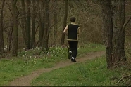 Futót kerülget az autó a Parkerdő felé vezető úton, az Emlékmű közelében. A szűk út miatt két autó is nehezen fér el egymás mellett, így eléggé balesetveszélyes itt kocogni. Pedig a forgalom nem kicsi: sokan járnak autóval a Parkerdőbe, van itt lakópark és kiskertek is.
