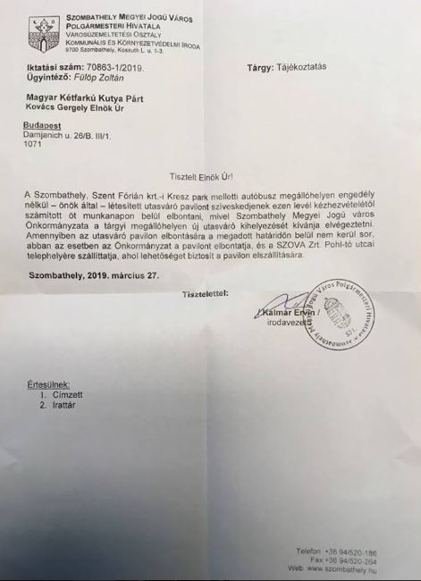 A pártnak öt napja van, hogy elvigye az építményt, ugyanis a helyén az önkormányzat szintén utasvárót szeretne kialakítani. A témáról forgató RTL Klubbal az alábbiakat közölték a szombathelyi városházán: