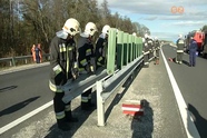 Bontják a szalagkorlátot az M86-oson gyakorlatozó tűzoltók. Verőfényes napsütésben modellezték, hogyan mentenék ki a hóban rekedt autókat. A kétszer két sávot elválasztó korlát leszerelésével átirányíthatják a forgalmat a szemközti sávba.
