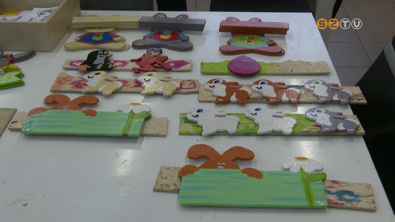 Dekorfűrésszel nyuszi figurákat vágnak ki rétegelt falemezből, ennél az asztalnál pedig színes barkácsfilcből varrják a barkadíszeket. Andrea 8 hónapja dolgozik itt közfoglalkoztatottként. Munkája kézügyességet és türelmet igényel, de ez számára nem szokatlan.