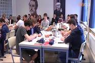 Egy kiállítás is kapcsolódik az információs naphoz. Ennek (02:46) az eszköznek az egyik része azt érzékeli, hogy melyik gombot nyomták meg, a másik a (02:26) ledet villantja fel. Ezzel például a (02:56) 18-as tananyagot mutatják be: Mikrovezérlők kommunikációja soros porton keresztül.