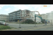 Így zajlik a szerkezeti bontás a kórház udvarán. A fűtési és a villanyvezetékeket, ill. a nyílászárókat már előtte eltávolították, így most már csak a falakat szedik szét. A kékcsempés épületnél folyamatosan dolgoznak a munkagépek.