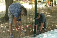 Alapanyagot kevernek a munkások az óvodai kerítés felújításához. Érdeklődve figyelik a gyerekek a több mint 40 éve változatlan állapotú lemezek felújítását: eddig tilos volt közel menniük, mert balesetveszélyessé vált az elöregedett fém.