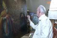Az utolsó simításokat végzi Marosfalvi Antal festőművész ezen a barokk oltárképen. Az olajfestmény rossz állapotban került hozzá: több mint száz órát dolgozott rajta, mire a kép elnyerte mostani formáját.