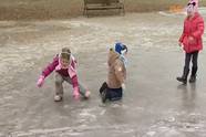 Nem zavarja a gyerekeket az esés sem: Melissa és Loretta szeret csúszkálni, örülnek a tócsából lett jégnek. Édesanyjuk félti őket, nehogy megsérüljenek játék közben.