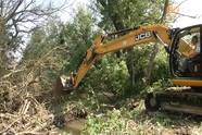 Szinte a mederrel azonos szélességű torlaszt számolt fel ez a lánctalpas markoló csütörtökön délelőtt a Répce tompaládonyi szakaszán.
