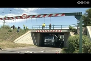 Ez a teherautó szorult be a felüljáró alá. A sofőr Mersevát felől jött, gond nélkül áthaladt a magasságjelző kapun, de a hídtestnek már nekiütközött a darukar, és az autó ott rekedt. A betongerenda kétoldalt mélyen berepedt, a pálya pedig megemelkedett.